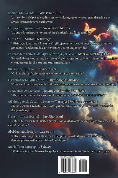 Colección "Alas de Papel" Vol. 2 Vuela - Fragmentos de Creatividad es una colección de relatos que atraviesa una variedad de géneros, emociones y perspectivas. Desde lo cotidiano hasta lo extraordinario, cada historia es una ventana a un universo único donde la imaginación no tiene límites. Este segundo volumen de la colección Ediciones SoldePau - Relatos para jóvenes y adultos nos invita a volar a través de narrativas diversas, en las que los personajes se enfrentan a sus sueños, miedos y esperanzas. Cada relato es una pieza que invita a reflexionar, a cuestionarse y, sobre todo, a sentir. Desde momentos de profundo realismo hasta pinceladas de fantasía y misterio, este libro promete llevar al lector en un viaje inolvidable por las profundidades de la creatividad humana. Deja que estas páginas te envuelvan en sus alas y te transporten a mundos donde todo es posible. Vuela no es solo una lectura; es una experiencia para quienes buscan más allá de lo evidente y están dispuestos a dejarse sorprender por la magia de las palabras. Relatos que componen esta antología * Sombras del pasado - Sofia Primo Ruiz "Las sombras del pasado podían ser aterradoras, pero siempre quedaba la luz y la verdad esperando ser descubiertas." * El agujero de gusano - Patricia García Macías "Lo que le faltaba para rematar el día de mierda que había tenido." * Eneas 2.0 - Santos C.S. Bermejo "Miriam, al igual que el Eneas de Virgilio, fundadora de una nueva estirpe y madre de ganadores, fue destinada a unir mundos y curar viejas heridas." * La verdadera historia de Caperucita Roja y el Lobo - Mar González Hernández "La verdad es que no sé muy bien por qué, yo creo que una caja de aspirinas hubiera sido mejor, pero nada, ella erre que erre, con los dulces." * Un viaje al infierno - Pino Betancor "Cada noche perfeccionaba sus movimientos con la espada." * El Paraíso de Kailani y Sirio - Lupe Moreno González "Porque es la estrella que más brilla en el firmamento y ahora esa estrella está conmigo." * La Muerte tiene derecho - Jovany Ant. Paulino Hernández "Mi papel es recordarles a los seres humanos que la vida es efímera y preciosa." * Mi alma gemela de cuatro patas - María José Rodríguez Apruzzese "Simba me había dado tanto en vida, y ahora, en su partida, me dio un último regalo: el regalo de la paz." * El susurro de la libertad - Jyoti Baharani "Estaba tan cerca de la libertad que casi podía saborearla, pero el peligro aún acechaba en cada sombra." * Abel Guelmes Roblejo - La cerquita "El tren no tenía parada oficial en La Cerquita, pero de alguna manera siempre se detenía para aquellos que sabían dónde bajar." * María Toret Campoy - 48 clavos "48 clavos, 144 martillazos, tres golpes por cada uno de los clavos, pum, pum, pum."