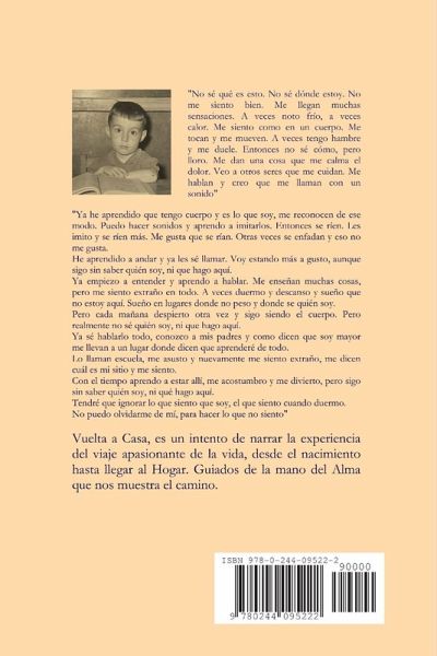 Vuelta a Casa describe el camino de descubrimiento de la consciencia primero de entidad humana y después del Alma para llegar al Ser. Se intenta compartir la experiencia vivida en cuanto a este camino de vuelta a Casa, al tiempo de aprender a vivir la vida humana en armonía, con la realidad del Alma. Compartir en el libro estas vivencias ha sido un gran reto que puede servir a muchas personas que estén verdaderamente interesadas en recorrer el camino real de volver al Hogar. Ha sido un proceso de muchos años de buscar en el interior, al tiempo de estar "con los pies en la tierra". Durante años he vivido en conflicto con la realidad humana, hasta que me ha llegado el momento de ser "un ser humano" en armonía con el Todo.