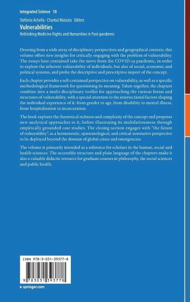 Drawing from a wide array of disciplinary perspectives and geographical contexts, this volume offers new insights for critically engaging with the problem of vulnerability. The essays here contained take the move from the COVID-19 pandemic, in order to explore the inherent vulnerability of individuals, but also of social, economic and political systems, and probe the descriptive and prescriptive import of the concept.Each chapter provides a self-contained perspective on vulnerability, as well as a specific methodological framework for questioning its meaning. Taken together, the chapters combine into a multi-disciplinary toolkit for approaching the various forms and structures of vulnerability, with a special attention to the intersectional factors shaping the individual experience of it: from gender to age, from disability to mental illness, from hospitalisation to incarceration. The book explores the theoretical richness and complexity of the concept and proposes new analyticalapproaches to it, before illustrating its multifariousness through empirically grounded case studies. The closing section engages with "the future of vulnerability", as a hermeneutic, epistemological, and critical-normative perspective to be deployed beyond the domain of global crises and emergencies.The volume is primarily intended as a reference for scholars in the human, social and health sciences. The accessible structure and plain language of the chapters make it also a valuable didactic resource for graduate courses in philosophy, the social sciences and public health.