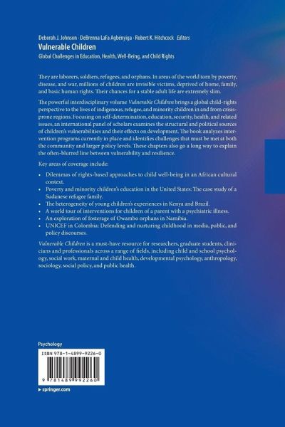 Vulnerable Children is a must-have volume for researchers, graduate students, and clinicians/professionals/practitioners across a range of fields, including child and school psychology, social work, maternal and child health, developmental psychology, anthropology, sociology, social policy, and public health.