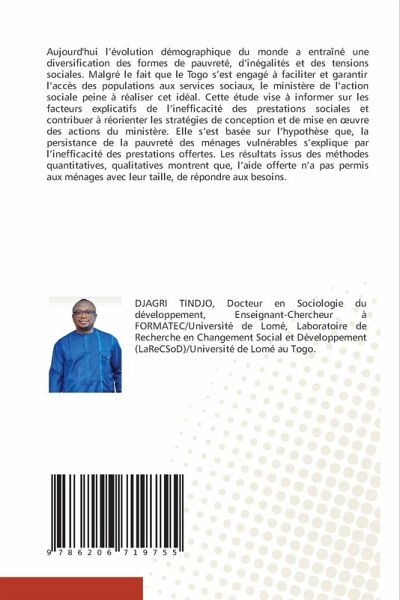 Aujourd'hui l'évolution démographique du monde a entraîné une diversification des formes de pauvreté, d'inégalités et des tensions sociales. Malgré le fait que le Togo s'est engagé à faciliter et garantir l'accès des populations aux services sociaux, le ministère de l'action sociale peine à réaliser cet idéal. Cette étude vise à informer sur les facteurs explicatifs de l'inefficacité des prestations sociales et contribuer à réorienter les stratégies de conception et de mise en oeuvre des actions du ministère. Elle s'est basée sur l'hypothèse que, la persistance de la pauvreté des ménages vulnérables s'explique par l'inefficacité des prestations offertes. Les résultats issus des méthodes quantitatives, qualitatives montrent que, l'aide offerte n'a pas permis aux ménages avec leur taille, de répondre aux besoins.