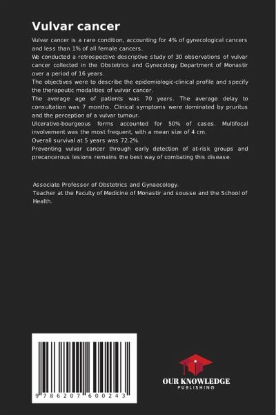 Vulvar cancer is a rare condition, accounting for 4% of gynecological cancers and less than 1% of all female cancers.We conducted a retrospective descriptive study of 30 observations of vulvar cancer collected in the Obstetrics and Gynecology Department of Monastir over a period of 16 years. The objectives were to describe the epidemiologic-clinical profile and specify the therapeutic modalities of vulvar cancer.The average age of patients was 70 years. The average delay to consultation was 7 months. Clinical symptoms were dominated by pruritus and the perception of a vulvar tumour. Ulcerative-bourgeous forms accounted for 50% of cases. Multifocal involvement was the most frequent, with a mean size of 4 cm.Overall survival at 5 years was 72.2%.Preventing vulvar cancer through early detection of at-risk groups and precancerous lesions remains the best way of combating this disease.