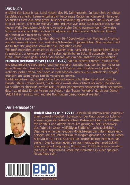 Friedrich Hermann Meyer (1854 - 1942) hat alle Facetten seines Traums von Amerika erlebt und beschreibt sie anschaulich und nuancenreich in der Sprache seiner Heimat - plattdeutsch. Letztlich gab bei ihm der Hang zur alten Heimat den Ausschlag, dass er nach 16 Jahren nach Hadeln zurückgekehrt ist, nicht als reicher Mann, aber doch so wohlhabend, dass er in Altenbruch und später in Otterndorf eine Existenz als Fotograf gründen und seine junge Familie versorgen konnte. Nachkriegswirren des 1. Weltkriegs und sozialistische Revolutionsversuche im Jahr 1919 ließen Land und Leute in Hadeln relativ unbeeindruckt, die Inflation wurde eher schlecht als recht überstanden. Da berührt es einerseits merkwürdig, ist aber andererseits zeitgeschichtlich bedeutsam, dass - zumindest für die Person des Autors - der Traum "Amerika" durch den Dämon "Adolf Hitler" ersetzt wird und alle Hoffnungen darauf gesetzt werden.