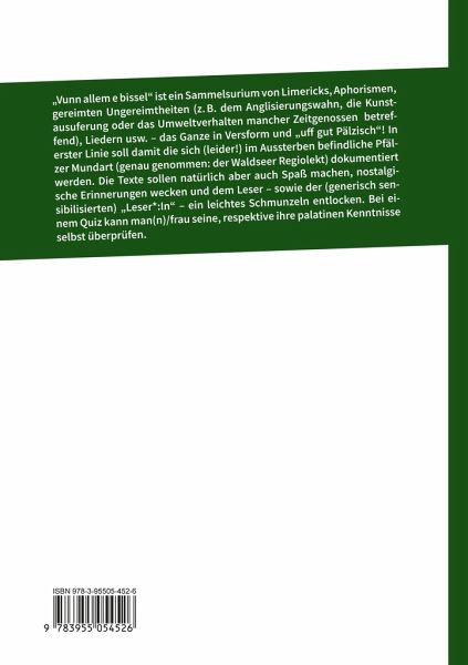 "Vunn allem e bissel" ist ein Sammelsurium von Limericks, Aphorismen, gereimten Ungereimtheiten (z. B. dem Anglisierungswahn, die Kunstausuferung oder das Umweltverhalten mancher Zeitgenossen betreffend), Liedern usw. - das Ganze in Versform und "uff gut Pälzisch"! In erster Linie soll damit die sich (leider!) im Aussterben befindliche Pfälzer Mundart (genau genommen: der Waldseer Regiolekt) dokumentiert werden. Die Texte sollen natürlich aber auch Spaß machen, nostalgische Erinnerungen wecken und dem Leser - sowie der (generisch sensibilisierten) "Leser_:In" - ein leichtes Schmunzeln…mehr