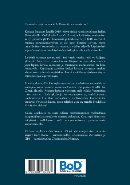 Tervetuloa nojatuolimatkalle Dolomiittien vuoristoon! Kirjassa kuvataan kesällä 2015 tehtyä pitkää vuoristovaellusta Italian Dolomiiteilla. Vaellukselle Alta Via 2 ¿reitin kallioisissa maisemissa kertyi pituutta yli 150 kilometriä ja korkeuseroa yli 8000 metriä eli mistään sunnuntaikävelystä ei ole kyse. Kirjasta selviää, miten omatoimisesti suunniteltu ja toteutettu vaellus Alpeilla käytännössä sujuu. Samalla saadaan monia käytännön vinkkejä omalle vaellusreissulle, tehtiinpä se sitten niin sanotusti soolona tai ryhmässä. Kirjassa peilataan Italian kokemuksia aiempiin vaelluskokemuksiin, joita riittää, sillä kirjoittaja on käynyt vuorilla vaeltamassa jo yhtenätoista vuotena peräkkäin. Lisäväriä tarinaan tuo se, että tämä varsin vaativa reitti on kuljettu yhdessä 13-vuotiaan lapsen kanssa. Kirjassa kerrotaankin monista käytännön asioista, joita lapsen kanssa Alpeilla vaeltaessa ja muutenkin matkustaessa on hyvä huomioida, sekä sattumuksista ja pienistä ongelmistakin, joita pitkällä kolmen viikon matkalla lapsen kanssa saattaa eteen tulla. Käytännön asioiden lisäksi kirjassa kuvataan matkan aikana eteen tulevia koomisiakin tilanteita sekä humoristiseen sävyyn elämänmenoa laajemminkin. Matkan alussa päästään myös tutustumaan vaellukseen suomalaisten vaeltajien viime vuosina suosiman Cortina d¿ampesson lähellä Tre Cimen alueella. Matkan lopussa vietetään vielä viikko Venetsiassa tutustuen sen nähtävyyksiin ja kulttuuritarjontaan, aurinkorantoja unohtamatta. Useinhan suomalaisten vaellusmatkat Dolomiiteille kulkevat Venetsian kautta, joten tältäkin osin on tarjolla hyödyllisiä käytännön vinkkejä. Näistä aineksista on saatu aikaan mielenkiintoinen vaellusloma, kaupunkiloma ja rantaloma samassa paketissa. Kirja sopii siten sekä erityisesti vaelluksesta että matkustamisesta yleisemminkin kiinnostuneille. Kirjassa on yli sata värivalokuvaa. Kirjoittajalta on julkaistu aiemmin kirjat Haute Route ¿ vuoristovaellus Chamonix¿sta Zermattiin ja GR5 ¿ vuoristovaellus Chamonix¿sta Nizzaan.