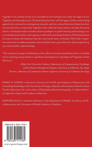 Contents: Joseph Glick: Dynamics in the «Sabor» of Vygotsky - Fernando González Rey: The Path to Subjectivity: Advancing Alternative Understandings of Vygotsky and the Cultural Historical Legacy - Guillermo Arias Beatón: The Process of Producing Knowledge: Vygotsky Revisited - Alex Kozulin: Cognitive Aspects of the Transition from a Traditional to a Modern Technological Society - Carl Ratner: Macro Cultural Psychology, the Psychology of Oppression, and Cultural-Psychological Enrichment - Pedro R. Portes: Vygotsky's Significance in Advancing Counseling and Psychotherapy - Jose Dergan: A Cultural-Historical Approach to Neuropsychological Treatment: Understanding Latino and Other Non-Dominant Groups - Luis C. Moll: Only Life Educates: Immigrant Families, the Cultivation of Biliteracy, and the Mobility of Knowledge - Carmen M. Martínez-Roldán/Peter Smagorinsky: Computer-Mediated Learning and Young Latino/a Students' Developing Expertise - Patricia Baquedano-López/Ariana Mangual Figueroa/Sera Jean Hernandez: An Integrated Approach to the Study of Transitions as Learning Activity: Two Cases from Spanish Immersion Classrooms - Leticia Tomas Bustillos/Robert Rueda/Estela Mara Bensimon: Faculty Views of Underrepresented Students in Community College Settings: Cultural Models and Cultural Practices - Margaret Gallego/Olga A. Vásquez: Praxis in Dis-coordination - Richard Durán: Development of Latino Family-School Engagement Programs in U.S. Contexts: Enhancements to Cultural Historical Activity Theory Accounts.