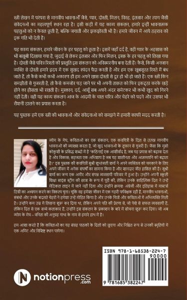 In women's writing, there has been a strong tradition to sing human emotions such as love, friendship, union, separation, waiting and renunciation. This anthology has a scintilla of every human emotion; on the one hand there is pain while on the other hand it is completely engrossed in the soft beauty of love; from separation to wait and then reunion, every side and dimension of love has been captured splendidly. A deeper insight into the sublime relationship of friendship makes this collection even more indelible. This lyrical collection very beautifully defines what agreements a woman goes through, how can she regain her strength, even if she is weakened, she still has the courage to muster up her strength and stand tall. She maintains her robustness while dissimulating all her tears, pain and anguish deep inside her heart. This poetic compendium tries to shed light on the character and face of today's man. On the other hand, the poet also elucidates every aspect of love enchantingly. Be it the pain of separation or exhilaration of reunion; infidelity or vulnerability; we can feel the sense of affiliation with every human emotion dealt in the poems. Each flower of this garland of lyrical poems explicates the cavernous heart of a woman like never before. Her smiles, her tears, her joys, her fears, her incessant struggle everything leaves us admiring her some more and fills our heart with a sense of esteem regard for every ordinary woman around us living an extra ordinary life.