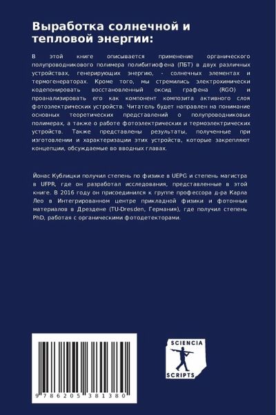 V ätoj knige opisywaetsq primenenie organicheskogo poluprowodnikowogo polimera polibitiofena (PBT) w dwuh razlichnyh ustrojstwah, generiruüschih änergiü, - solnechnyh älementah i termogeneratorah. Krome togo, my stremilis' älektrohimicheski kodeponirowat' wosstanowlennyj oxid grafena (RGO) i proanalizirowat' ego kak komponent kompozita aktiwnogo sloq fotoälektricheskih ustrojstw. Chitatel' budet naprawlen na ponimanie osnownyh teoreticheskih predstawlenij o poluprowodnikowyh polimerah, a takzhe o rabote fotoälektricheskih i termoälektricheskih ustrojstw. Takzhe predstawleny rezul'taty, poluchennye pri izgotowlenii i harakterizacii ätih ustrojstw, kotorye zakreplqüt koncepcii, obsuzhdaemye wo wwodnyh glawah.