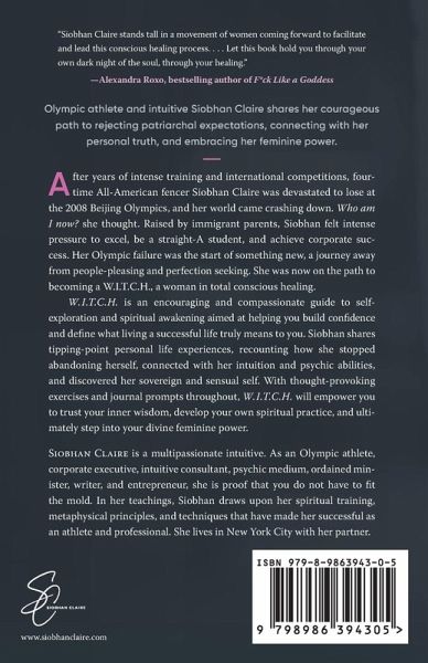 Heed the Call and Step into Your Power After years of intense training and international competitions, four-time All-American fencer Siobhan Claire was devastated to lose at the 2008 Beijing Olympics, and her world came crashing down. Who am I now? she thought. Raised by immigrant parents, Siobhan felt intense pressure to excel, be a straight-A student, and achieve corporate success. Her Olympic failure was the start of something new, a journey away from people-pleasing and perfection seeking. She was now on the path to becoming a W.I.T.C.H., a woman in total conscious healing. W.I.T.C.H. is an encouraging and compassionate guide to self-exploration and spiritual awakening aimed at helping you build confidence and define what living a successful life truly means to you. Siobhan shares tipping-point personal life experiences, recounting how she stopped abandoning herself, connected with her intuition and psychic abilities, and discovered her sovereign and sensual self. With thought-provoking exercises and journal prompts throughout, W.I.T.C.H. will empower you to trust your inner wisdom, develop your own spiritual practice, and ultimately step into your divine feminine power.