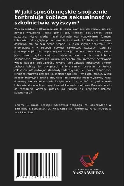W ci¿gu ostatnich 100 lat podej¿cie do seksu i równo¿ci p¿ci zmieni¿o si¿, aby powitä wyzwolenie kobiet; jednak tabu kobiecej seksualno¿ci wci¿¿ pozostaje. M¿ska w¿adza nadal dominuje nad odpowiednimi formami kobieco¿ci, od wygl¿du po zachowanie i seksualno¿¿. Niniejsza rozprawa doktorska ma na celu ocen¿ stopnia, w jakim m¿skie spojrzenie jest internalizowane w kulturze instytucji szkolnictwa wy¿szego, które s¿ postrzegane jako promuj¿ce indywidualizacj¿ i wolno¿¿ seksualn¿, oraz w jaki sposób m¿skie spojrzenie dziäa w celu kontrolowania kobiecej seksualno¿ci. Wspó¿czesna kultura licencjacka ma sprzeczne oczekiwania wobec kobiecej seksualno¿ci, wysoka seksualizacja m¿odszych pokole¿ zach¿ca kobiety do rozwi¿z¿o¿ci na tym samym poziomie, co kultura ch¿opaków, ale podwójne standardy zak¿adaj¿ os¿d tej formy seksualno¿ci. Niniejsza rozprawa pomaga studentom socjologii i feminizmu zbadä, w jaki sposób tradycyjne binaria p¿ci, takie jak kompleks madonny/dziwki, nadal dominuj¿ we wspó¿czesnych instytucjach i zrozumie¿, w jaki sposób kobieco¿¿ stoi w obliczu ci¿g¿ych paradoksalnych oczekiwä. Prowadzi nas to do rozwäenia wänego pytania, jak rozwinie si¿ przysz¿o¿¿ kobiecej seksualno¿ci?