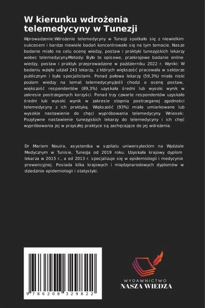 Wprowadzenie:Wdro¿enie telemedycyny w Tunezji spotkäo si¿ z niewielkim sukcesem i bardzo niewiele badä koncentrowäo si¿ na tym temacie. Nasze badanie miäo na celu ocen¿ wiedzy, postaw i praktyki tunezyjskich lekarzy wobec telemedycyny.Metody: By¿o to opisowe, przekrojowe badanie online wiedzy, postaw i praktyk przeprowadzone w pädzierniku 2022 r. Wyniki: W badaniu wzi¿¿o udziä 243 lekarzy, z których wi¿kszo¿¿ pracowäa w sektorze publicznym i by¿a specjalistami. Ponad po¿owa lekarzy (59,3%) miäa niski poziom wiedzy na temat telemedycyny.Je¿li chodzi o ocen¿ postaw, wi¿kszo¿¿ respondentów (89,3%) uzyskäa ¿redni lub wysoki wynik w zakresie postrzeganych korzy¿ci. Ponad trzy czwarte respondentów uzyskäo ¿redni lub wysoki wynik w zakresie stopnia postrzeganej zgodno¿ci telemedycyny z ich praktyk¿. Wi¿kszo¿¿ (93%) miäa umiarkowane lub wysokie nastawienie do ch¿ci wypróbowania telemedycyny. Wniosek: Pozytywne nastawienie tunezyjskich lekarzy do telemedycyny i ich ch¿¿ wypróbowania jej w przysz¿ej praktyce s¿ zach¿caj¿ce do jej wdro¿enia.