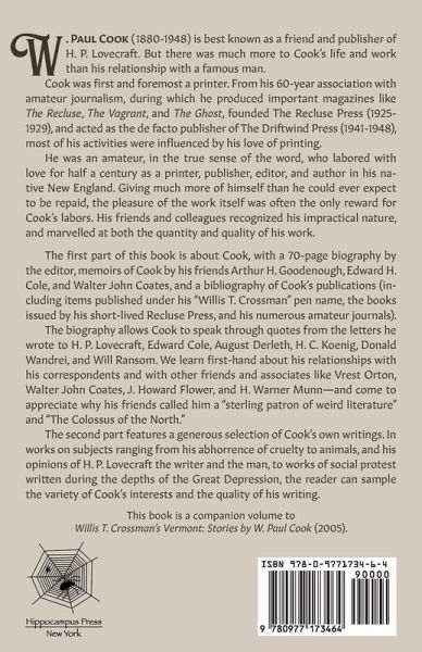W. Paul Cook is remembered most often as a friend of H. P. Lovecraft; and so he has lingered posthumously in the shadow of his famous friend. He labored with love for half a century as a printer, publisher, editor, and author; the pleasure of the work itself was often the only reward for his labors. The purpose of this book is to place Cook in his own light; to illuminate his own talents as a writer of fiction, essays, and poetry; as a publisher and printer; and as a sincere exponent of amateur journalism. We will re-open the door, as best we can, to understand and appreciate the life of a modest man who styled himself "an ordinary printer," but whom friends called "the Colossus of the North" and a "sterling patron of weird literature."