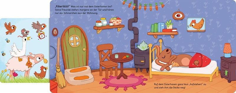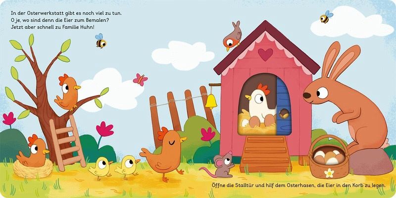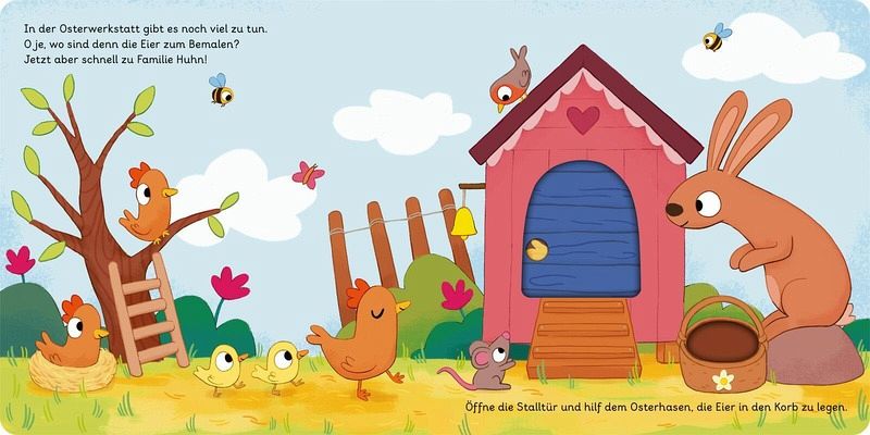 Kurze, liebevoll erzählte Ostergeschichte zum MitmachenMit Schiebe- und Drehelementen auf jeder Seite: großer Osterspaß garantiert