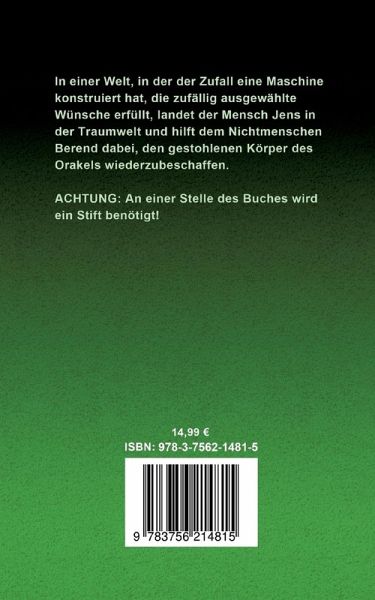 In einer Welt, in der der Zufall eine Maschine konstruiert hat, die zufällig ausgewählte Wünsche erfüllt, landet der Mensch Jens in der Traumwelt und hilft dem Nichtmenschen Berend dabei, den gestohlenen Körper des Orakels wiederzubeschaffen.