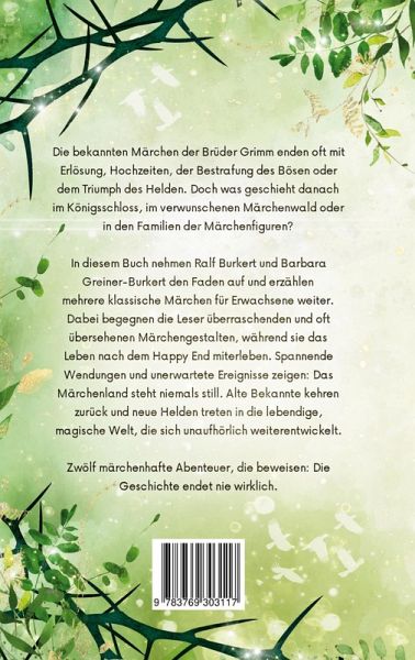 Die bekannten Märchen der Brüder Grimm enden oft mit Erlösung, Hochzeiten, der Bestrafung des Bösen oder dem Triumph des Helden. Doch was geschieht danach im Königsschloss, im verwunschenen Märchenwald oder in den Familien der Märchenfiguren? In diesem Buch nehmen Ralf Burkert und Barbara Greiner-Burkert den Faden auf und erzählen mehrere klassische Märchen für Erwachsene weiter. Dabei begegnen die Leser überraschenden und oft übersehenen Märchengestalten, während sie das Leben nach dem Happy End miterleben. Spannende Wendungen und unerwartete Ereignisse zeigen: Das Märchenland steht niemals still. Alte Bekannte kehren zurück und neue Helden treten in die lebendige, magische Welt, die sich unaufhörlich weiterentwickelt. Zwölf märchenhafte Abenteuer, die beweisen: Die Geschichte endet nie wirklich.