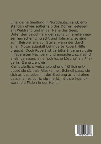 Eine kleine Siedlung in Norddeutschland, entstanden etwas außerhalb des Dorfes, gelegen am Waldrand und in der Nähe des Sees. Unter den Bewohnern der sechs Einfamilienhäuser herrschen Eintracht und Toleranz, so sind zum Beispiel alle zur Stelle, wenn der durch einen Motorradunfall behinderte Robert Hilfe braucht. Doch Robert ist verbittert, vergrault die hilfsbereiten Nachbarn und engagiert, schließlich allein gelassen, eine "polnische Lösung" als Pflegerin: Elena zieht ein. Klein, zierlich, weizenblond und fröhlich entpuppt sie sich als Alleskönner. Schnell passt sie sich an das Leben in der…mehr