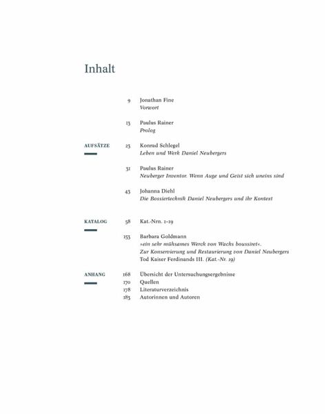 Der Katalog beleuchtet Neubergers Tätigkeit am Wiener Kaiserhof zwischen 1650 und 1663, wo er für Kaiser Ferdinand III. und dessen Söhne als Wachsbossierer, Porträtist und Edelsteinschneider tätig war. Zwei seiner bedeutendsten Werke, ein 60-teiliger Zyklus der Metamorphosen nach Ovid sowie eine allegorische Darstellung auf den Tod Kaiser Ferdinands III., stehen hier im Mittelpunkt. Ergänzt durch eine umfassende kunsthistorische und konservierungswissenschaftliche Analyse, ermöglicht die Publikation einen vertieften Einblick in Neubergers Werk und Technik.