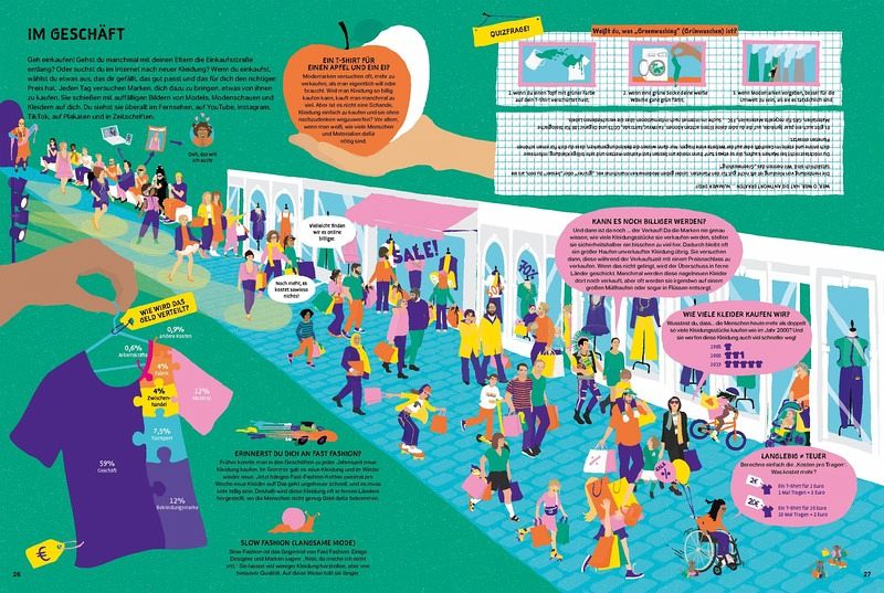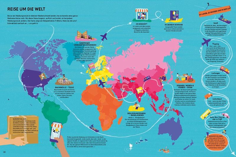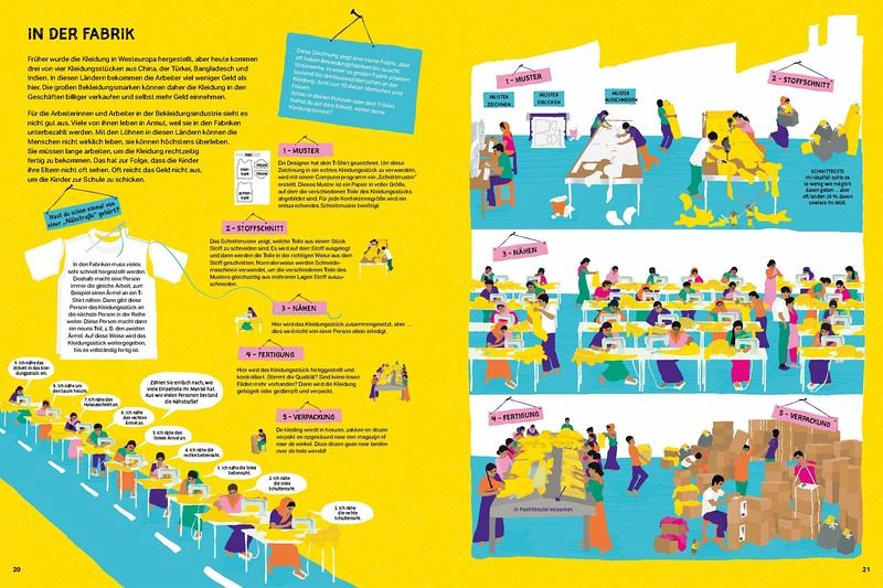 Nachhaltige Mode ist ein immer häufiger verwendeter Begriff in der Modeindustrie, aber woher wissen wir, ob unser Lieblingskleidungsstück wirklich nachhaltig ist? Jasmien Wynants (Text) und Judith Thomas (Illustration) haben deshalb dieses Kinderbuch herausgebracht und erklären darin detailliert, was bei der Herstellung von Kleidung so alles passiert - vom Design bis zur Produktion, aber auch vom Transport über das Tragen bis zum Recycling. Sie fingen mit der Frage an: Wie wird eigentlich ein T-Shirt hergestellt? Welche Auswirkungen hat das auf unseren Planeten? Und könnte man es besser machen? Wusstest du vielleicht, dass... dein T-Shirt bereits um die Welt gereist ist, bevor es in deinem Kleiderschrank landet?... für die Herstellung eines T-Shirts so viel Wasser benötigt wird, wie du von deiner Geburt bis zu deinem siebten Lebensjahr trinkst?... Kleidung aus Bäumen, Pflanzen, Kühen, Schafen und sogar Erdöl hergestellt wird?... jede Sekunde ein ganzer Lastwagen voller Kleidung verbrannt oder entsorgt wird?