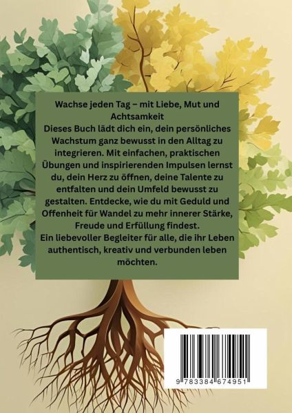 Das Buch "Wachse jeden Tag" handelt davon, wie du dein persönliches Wachstum bewusst in deinen Alltag integrieren kannst. Es zeigt dir Schritt für Schritt, wie du mit einfachen und praxisnahen Übungen sowie inspirierenden Impulsen dein Herz öffnest, deine Talente entfaltest und dein Umfeld bewusst gestaltest. Das Buch unterstützt dich darin, Achtsamkeit, Selbstentfaltung, innere Stärke, Geduld und Offenheit für Wandel zu entwickeln.Es ist kein theoretisches Werk, sondern ein praktischer Begleiter, der dich motiviert, deine persönliche Entwicklung liebevoll und nachhaltig zu gestalten. Du lernst, dich selbst besser kennenzulernen, Rückschläge als Chancen zu sehen, echte Verbundenheit zu fördern und deinen eigenen Weg authentisch zu gehen. So hilft dir das Buch, mehr Freude, Selbstbewusstsein und Erfüllung in dein Leben zu bringen und dein volles Potenzial zu entfalten.Kurz gesagt: Dieses Buch ist für alle, die ihr Leben mit Liebe, Mut und Achtsamkeit wachsen lassen wollen und dabei praktische Werkzeuge im Alltag suchen.