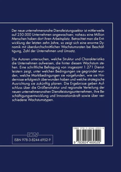 Der neue unternehmensnahe Dienstleistungssektor ist mittlerweile auf 250.000 Unternehmen angewachsen; nahezu eine Million Menschen haben dort ihren Arbeitsplatz. Betrachtet man die Entwicklung der letzten zehn Jahre, so zeigt sich eine enorme Dynamik mit überdurchschnittlichen Wachstumsraten bei Beschäftigung, Zahl der Unternehmen und Umsatz. Die Autoren untersuchen, welche Struktur und Charakteristika die Unternehmen aufweisen, die hinter diesem Wachstum stehen. Eine schriftliche Befragung von insgesamt 1.271 Dienstleistern zeigt, unter welchen Bedingungen sie gegründet wurden, welche Marktbedingungen sie vorgefunden, wie sie Hindernisse erfolgreich überwunden haben und welche strategische Ausrichtung sie zukünftig planen. Die Ergebnisse geben Aufschluss über die Größenstruktur und regionale Verteilung der neuen unternehmensnahen Dienstleistungsunternehmen, ihre Beschäftigungsentwicklung und Innovationskraft sowie über verschiedene Wachstumstypen.