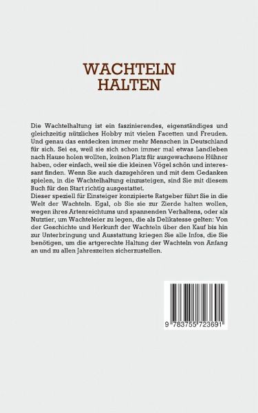 Die Wachtelhaltung ist ein faszinierendes, eigenständiges und gleichzeitig nützliches Hobby mit vielen Facetten und Freuden. Und genau das entdecken immer mehr Menschen in Deutschland für sich. Sei es, weil sie sich schon immer mal etwas Landleben nach Hause holen wollten, keinen Platz für ausgewachsene Hühner haben, oder einfach, weil sie die kleinen Vögel schön und interessant finden. Wenn Sie auch dazugehören und mit dem Gedanken spielen, in die Wachtelhaltung einzusteigen, sind Sie mit diesem Buch für den Start richtig ausgestattet.Dieser speziell für Einsteiger konzipierte Ratgeber führt Sie in die Welt der Wachteln. Egal, ob Sie sie zur Zierde halten wollen, wegen ihres Artenreichtums und spannenden Verhaltens, oder als Nutztier, um Wachteleier zu legen, die als Delikatesse gelten: Von der Geschichte und Herkunft der Wachteln über den Kauf bis hin zur Unterbringung und Ausstattung kriegen Sie alle Infos, die Sie benötigen, um die artgerechte Haltung der Wachteln von Anfang an und zu allen Jahreszeiten sicherzustellen.