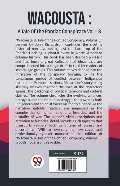 "Wacousta: A Tale of the Pontiac Conspiracy, Volume 3," penned by John Richardson, continues the riveting historical narrative set against the backdrop of the Pontiac Uprising, a pivotal event in North American colonial history. This book has been deemed a classic and has been a great collection of ideas that are comprehended into a single draft to read by readers of several age groups. This volume delves deeper into the intricacies of the conspiracy, bringing to life the tumultuous period of conflict between Indigenous nations and European settlers. Richardson's storytelling skillfully weaves together the lives of the characters against the backdrop of political tensions and cultural clashes. The volume chronicles the evolving alliances, betrayals, and the relentless struggle for power as both Indigenous and colonial forces vie for dominance. As the narrative unfolds, readers are immersed in the complexities of human emotions, loyalties, and the brutality of war. The author's vivid descriptions and attention to historical detail provide a rich tapestry that transports readers back to a time of unrest and uncertainty. With an eye-catching new cover, and professionally typeset manuscript, this edition of "Wacousta: A Tale of the Pontiac Conspiracy, Volume 3," is both modern and readable.