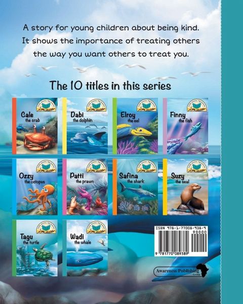 Wadi the whale not only tells an entertaining story but also highlights the importance of being kind and treating others the way you want others to treat you. Take a dive into this delightful book and join Wadi, the polite whale, on his deep-sea adventure. Wadi the whale is one of the ten books in the exciting Sea stories series by popular children's author Jacqui Shepherd. Each book features a different sea creature and highlights an important life lesson through the story. The stunningly beautiful, full-colour illustrations by Matthew Ziranek bring the undersea world to life. The simple and accessible language makes these books suitable for both first- and second-language learners. They are perfect for reading to little ones and for older children to read by themselves. Other titles in the series include: Cale the crab Dabi the dolphin Elroy the eel Finny the fish Ozzy the octopus Patti the prawn Safina the shark Suzy the seal Tagu the turtle. Get them all! By relating to the lovable characters featured in these stories children will not only be entertained but also be encouraged to adopt values and attitudes that will help them in their daily lives. Other series by Jacqui Shepherd include: Animal adventures Bug stories Farm-tastic. Follow our Awareness Publishing Facebook page for the latest news and updates on this and other series.