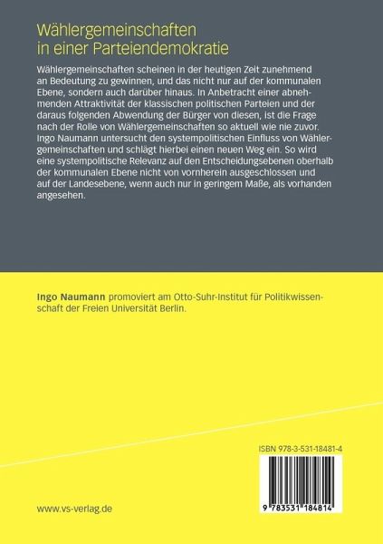 Wählergemeinschaften scheinen in der heutigen Zeit zunehmend an Bedeutung zu gewinnen, und das nicht nur auf der kommunalen Ebene, sondern auch darüber hinaus. In Anbetracht einer abnehmenden Attraktivität der klassischen politischen Parteien und der daraus folgenden Abwendung der Bürger von diesen, ist die Frage nach der Rolle von Wählergemeinschaften so aktuell wie nie zuvor. Ingo Naumann untersucht den systempolitischen Einfluss von Wählergemeinschaften und schlägt hierbei einen neuen Weg ein. So wird eine systempolitische Relevanz auf den Entscheidungsebenen oberhalb der kommunalen Ebene nicht von vornherein ausgeschlossen und auf der Landesebene, wenn auch nur in geringem Maße, als vorhanden angesehen.