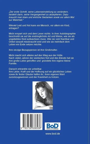 Die 1971 im Schwarzwald geborene Michi beschreibt ihre eigene Lebensgeschichte von ihrer traurigen Kindheit, wie sie ihre Familie - vor allem ihre Mutter - ablehnt und sie mit ihren körperlichen und seelischen Qualen lebte. Ihre nach außen hin immer perfekt wirkende Vorzeigefamilie, getrimmt auf Wohlstand und Ansehen, ist nur Schein. Während sie außer Haus vom Nachbar und Onkel sexuell missbraucht wird, schauen ihre Eltern stets weg und wollen von nichts wissen. Alles und jeder muss einfach immer funktionieren. Alleine muss sie einen Weg finden, mit ihrem Schicksal zu leben. Als Jugendliche will sie sich immer wieder das Leben nehmen. Authentische Tagebucheinträge runden ihre Erzählungen ab. In ihrer Jugend steht sie ganz plötzlich mit ihrer Mutter vor Gericht. Mit 18 Jahren lernt sie ihren heutigen Mann kennen. Michi ist verheiratet, hat 2 Kinder und wohnt im Schwarzwald, in der Nähe von Stuttgart. Im Erwachsenenalter ist sie durch die seelischen Belastungen unheilbar erkrankt und findet wieder einen Weg, um zu überleben. Das Buch handelt aber auch von den Jahren, in denen sie sich mit ihrer Vergangenheit auseinandersetzt und lernt, trotz allem ein erfülltes und glückliches Leben zu führen. Wie sie es schafft, ein offener und liebevoller Mensch zu sein. Sie ist Spiel- und Theaterpädagogin. Ihren Wunsch, Tierärztin zu studieren, konnte sie nie verwirklichen.