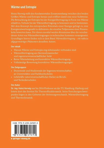 Heinz Herwig stellt den fundamentalen Zusammenhang zwischen den beiden Größen Wärme und Entropie heraus und eröffnet damit eine neue Sichtweise. Die Betrachtung der Entropie bei der Energieübertragung in Form von Wärme erlaubt es, Verluste bei der Wärmeübertragung zu benennen und zu bestimmen. Mit dem Konzept des entropischen Potentials einer Energie gelingt es, eine Energieentwertungszahl zu definieren, die einzelne Teilprozesse einer Prozesskette bewerten kann. Für dieses essential werden Kenntnisse über die verschiedenen Arten von Wärmeübertragungen in technischen Systemen vorausgesetzt. Grundlagen hierzu finden sich in dem Band Wärmeübertragung - ein nahezu allgegenwärtiges Phänomen desselben Autors.