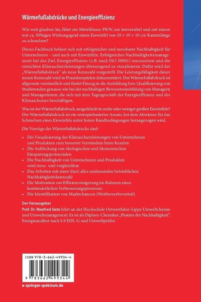 Dieses Fachbuch befasst sich mit erfolgreicher und messbarer Nachhaltigkeit für Unternehmen - und auch mit Eiswürfeln. Erfolgreiches Nachhaltigkeitsmanagement hat das Ziel, Energieeffizienz (z.B. nach ISO 50001) umzusetzen und die erreichten Klimaschutzleistungen überzeugend zu visualisieren. Dafür wird der "Wärmefußabdruck" als neue Kennzahl vorgestellt. Die Leistungsfähigkeit dieser neuen Kennzahl wird in Praxisbeispielen dokumentiert. Der Wärmefußabdruck ist allgemein verständlich und findet Einzug in die Ausbildung bzw. Qualifizierung von Studierenden genauso wie bei der nachhaltigen Bewusstseinsbildung von Managern und Managerinnen, die sich mit dem Tagesgeschäft der Energieeffizienz und des Klimaschutzes beschäftigen.