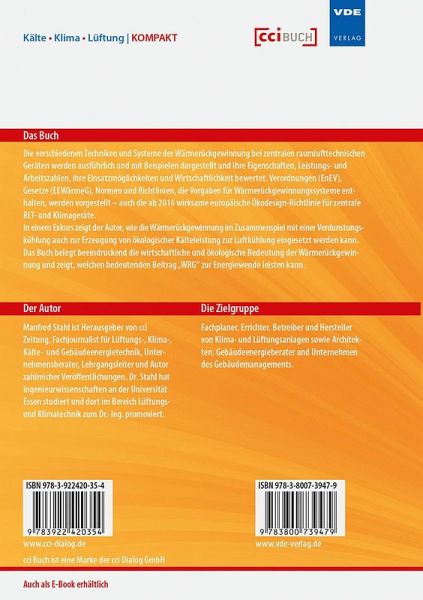 Die verschiedenen Techniken und Systeme der Wärmerückgewinnung bei zentralen raumlufttechnischen Geräten werden ausführlich und mit Beispielen dargestellt und ihre Eigenschaften, Leistungs- und Arbeitszahlen, ihre Einsatzmöglichkeiten und Wirtschaftlichkeit bewertet. Verordnungen (EnEV), Gesetze (EEWärmeG), Normen und Richtlinien, die Vorgaben für Wärmerückgewinnungssysteme enthalten, werden vorgestellt - auch die ab 2016 wirksame europäische Ökodesign-Richtlinie für zentrale RLT- und Klimageräte.In einem Exkurs zeigt der Autor, wie die Wärmerückgewinnung im Zusammenspiel mit einer Verdunstungskühlung auch zur Erzeugung von ökologischer Kälteleistung zur Luftkühlung eingesetzt werden kann. Das Buch belegt beeindruckend die wirtschaftliche und ökologische Bedeutung der Wärmerückgewinnung und zeigt, welchen bedeutenden Beitrag "WRG" zur Energiewende leisten kann.Die neue Reihe Kälte - Klima - Lüftung KOMPAKT ermöglicht es insbesondere Praktikern, Seiten- und Quereinsteigern sowie Berufsanfängern, sich schnell in einzelne Themen der Kälte-, Klima- und Lüftungstechnik einzuarbeiten. Sie entsteht in enger Zusammenarbeit zwischen dem VDE VERLAG und der cci Dialog GmbH.