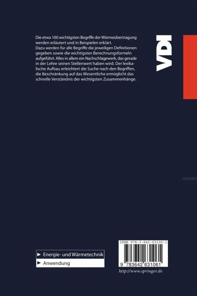 Die etwa 100 wichtigsten Begriffe der Wärmeübertragung werden erläutert und in Beispielen erklärt. Die wichtigsten Berechnungsformeln werden aufgeführt, die wichtigsten Definitionen zusammengestellt. Alles in allem ein rundes Nachschlagewerk, das gerade in der Lehre seinen Stellenwert haben wird. Der lexikalische Aufbau erleichtert die Suche nach den Begriffen, die Beschränkung auf das Wesentliche ermöglicht das schnelle Verständnis der wichtigen Zusammenhänge.