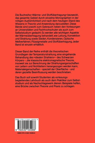 Der Wärmeübergang durch Strahlung hat in den letzten Jahren erheblich an Bedeutung gewonnen, vor allem durch die Raumfahrttechnik, Sonnenenergiegewinnung, Energiesparmaßnahmen usw. Dieser Band der Reihe enthält die theoretischen Grundlagen der Temperaturstrahlung, eine eingehende Behandlung des "idealen Strahlers" - des Schwarzen Körpers -, die klassische elektromagnetische Theorie, insoweit sie zur Berechnung der Strahlungseigenschaften von Leitern und Nichtleitern herangezogen werden kann, Materialeigenschaften - speziell der Oberfläche - und deren gezielte Beeinflussung werden beschrieben. An den deutschen Hochschulen wird dieses Gebiet jedoch kaum ausführlich behandelt. Das Buch soll daher sowohl den Studenten als die Vorlesung begleitendes Lehrbuch als auch dem planenden Ingenieur und Praktiker als Lehrbuch zum Selbststudium und als Nachschlagewerk dienen. Durchgerechnete Beispiele sollen helfen, die Theorie mit der Praxis zu verbinden.