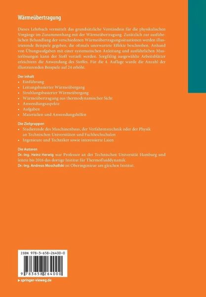 Dieses Lehrbuch vermittelt das grundsätzliche Verständnis für die physikalischen Vorgänge im Zusammenhang mit der Wärmeübertragungssituationen. Mittlerweile helfen 24 illustrierende Beispiele zum besseren Verständnis und beschreiben oftmals unerwartete interessante Alltagseffekte. Anhand von Übungsaufgaben mit ausführlichen Musterlösungen kann der Lehrstoff verstanden werden. Hier wird das SMART-Konzept eingesetzt, das hilft, Aufgaben mit einer sehr systematischen Vorgehensweise sicher zu lösen.