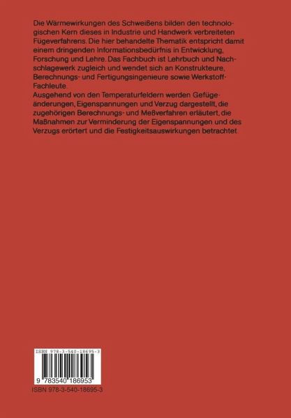 1 Einführung.- 1.1 Phänomene, Begriffe, Einflußgrößen.- 1.2 Entstehung, Veränderung, Beseitigung von Schweißeigenspannungen.- 1.3 Arten von Schweißeigenspannungsfeldern.- 1.4 Arten von Schweißformänderungen.- 1.5 Fachbuchhinweise und Darstellungsgesichtspunkte.- 2 Temperaturfelder beim Schweißen.- 2.1 Grundlagen.- 2.2 Globale Temperaturfelder.- 2.3 Lokale Wärmewirkung auf Schmelzzone.- 2.4 Wärmewirkung auf Wärmeeinflußzone.- 3 Eigenspannungen und Verzug beim Schweißen.- 3.1 Grundlagen.- 3.2 Finit-Element-Modelle.- 3.3 Schrumpfkraft- und Eigenspannungsquellmodelle.- 3.4 Praxisrelevante Übersicht zu Schweißeigenspannungen.- 3.5 Schweißverzug.- 3.6 Eigenspannungs- und Verzugsmessung, Modellgesetze.- 4 Verminderung von Schweißeigenspannungen und Schweißverzug.- 4.1 Notwendigkeit und Art der Maßnahmen.- 4.2 Konstruktive Maßnahmen.- 4.3 Werkstofftechnische Maßnahmen.- 4.4 Fertigungstechnische Maßnahmen.- 5 Festigkeitsauswirkungen des Schweißens (Übersicht).