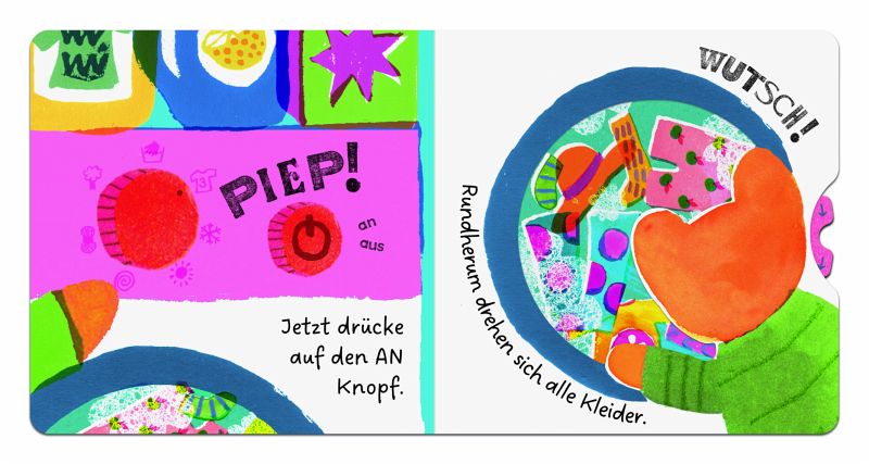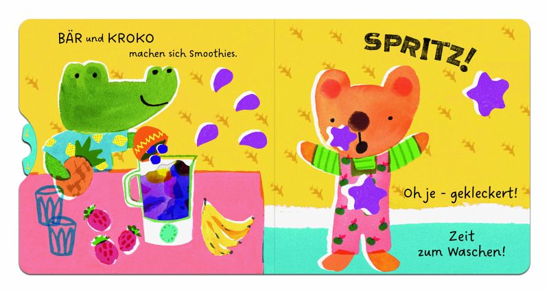 Der kleine Bär und das Krokodil machen sich ein Smoothie. Als sie sich bekleckern, wollen sie ihre T-Shirts waschen: also rein in die Waschmaschine, Waschmittel dazu, anschalten, fertig! Wäschewaschen macht Spaß und ist kinderleicht!- Einführung in die Hausarbeit, kindgerecht erklärt- Weitere Titel zum Thema Kochen und Gartenarbeit in Planung- Robustes Pappbilderbuch mit Klappen, Rädern und einem SchieberFür Kinder ab 18 Monaten