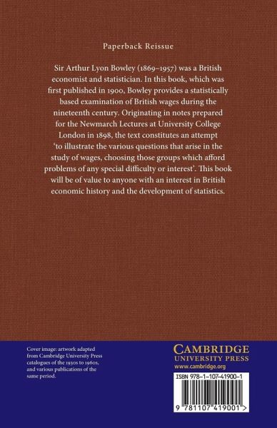 Sir Arthur Lyon Bowley (1869-1957) was a British economist and statistician. In this book, which was first published in 1900, Bowley provides a statistically based examination of British wages during the nineteenth century. Originating in notes prepared for the Newmarch Lectures at University College London in 1898, the text constitutes an attempt 'to illustrate the various questions that arise in the study of wages, choosing those groups which afford problems of any special difficulty or interest'. This book will be of value to anyone with an interest in British economic history and the development of statistics.