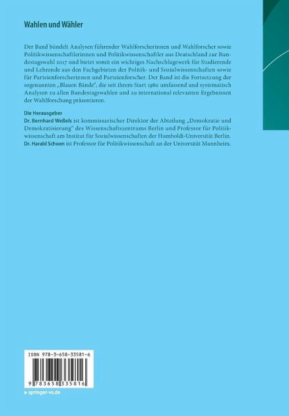 Der Band bündelt Analysen führender Wahlforscherinnen und Wahlforscher sowie Politikwissenschaftlerinnen und Politikwissenschaftler aus Deutschland zur Bundestagswahl 2017 und bietet somit ein wichtiges Nachschlagewerk für Studierende und Lehrende aus den Fachgebieten der Politik- und Sozialwissenschaften sowie für Parteienforscherinnen und Parteienforscher. Der Band ist die Fortsetzung der sogenannten "Blauen Bände", die seit ihrem Start 1980 umfassend und systematisch Analysen zu allen Bundestagswahlen und zu international relevanten Ergebnissen der Wahlforschung präsentieren.