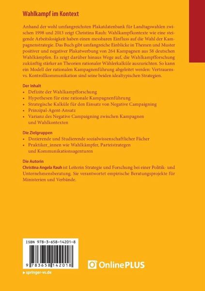 Anhand der wohl umfangreichsten Plakatdatenbank für Landtagswahlen zwischen 1998 und 2013 zeigt Christina Rauh: Wahlkampfkontexte wie eine steigende Arbeitslosigkeit haben einen messbaren Einfluss auf die Wahl der Kampagnenstrategie. Das Buch gibt umfangreiche Einblicke in Themen und Muster positiver und negativer Plakatwerbung von 264 Kampagnen aus 58 deutschen Wahlkämpfen. Es zeigt darüber hinaus Wege auf, die Wahlkampfforschung zukünftig stärker an Theorien rationaler Wählerkalküle auszurichten. So kann ein Modell der rationalen Kampagnenführung abgeleitet werden: Vertrauens- vs. Kontrollkommunikation sind seine beiden idealtypischen Strategien.