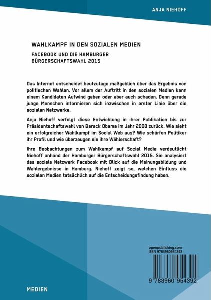 Das Internet entscheidet heutzutage maßgeblich über das Ergebnis von politischen Wahlen. Vor allem der Auftritt in den sozialen Medien kann einem Kandidaten Aufwind geben oder aber auch schaden. Denn gerade junge Menschen informieren sich inzwischen in erster Linie über die sozialen Netzwerke.Anja Niehoff verfolgt diese Entwicklung in ihrer Publikation bis zur Präsidentschaftswahl von Barack Obama im Jahr 2008 zurück. Wie sieht ein erfolgreicher Wahlkampf im Social Web aus? Wie schärfen Politiker ihr Profil und wie überzeugen sie ihre Wählerschaft?Ihre Beobachtungen zum Wahlkampf auf Social Media verdeutlicht Niehoff anhand der Hamburger Bürgerschaftswahl 2015. Sie analysiert das soziale Netzwerk Facebook mit Blick auf die Meinungsbildung und Wahlergebnisse in Hamburg. Niehoff zeigt so, welchen Einfluss die sozialen Medien tatsächlich auf die Entscheidungsfindung haben.Aus dem Inhalt:- Digitalisierung;- Präferenzwahl;- Listenplatzeffekt;- Ballot Position Effect;- Social-Web-Applikation