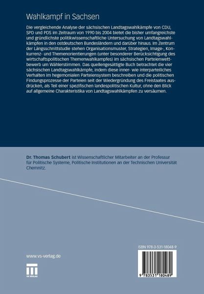 Die vergleichende Analyse der sächsischen Landtagswahlkämpfe von CDU, SPD und PDS im Zeitraum von 1990 bis 2004 bietet die bisher umfangreichste und gründlichste politikwissenschaftliche Untersuchung von Landtagswahlkämpfen in den ostdeutschen Bundesländern und darüber hinaus. Im Zentrum der Längsschnittstudie stehen Organisationsmuster, Strategien, Image-, Konkurrenz- und Themenorientierungen (unter besonderer Berücksichtigung des wirtschaftspolitischen Themenwahlkampfes) im sächsischen Parteienwettbewerb um Wählerstimmen. Das quellengesättigte Buch betrachtet die vier sächsischen Landtagswahlkämpfe, indem diese inner- wie interparteiliches Verhalten im hegemonialen Parteiensystem beschreiben und die politischen Findungsprozesse der Parteien seit der Wiedergründung des Freistaates ausdrücken, als Teil einer spezifischen landespolitischen Kultur, ohne den Blick auf allgemeine Charakteristika von Landtagswahlkämpfen zu versäumen.