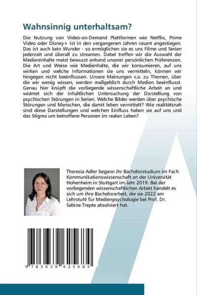 Die Nutzung von Video-on-Demand Plattformen wie Netflix, Prime Video oder Disney+ ist in den vergangenen Jahren rasant angestiegen. Das ist auch kein Wunder - so ermöglichen sie es uns Filme und Serien jederzeit und überall zu streamen. Dabei treffen wir die Auswahl der Medieninhalte meist bewusst anhand unserer persönlichen Präferenzen. Die Art und Weise wie Medienhalte, die wir konsumieren, auf uns wirken und welche Informationen sie uns vermitteln, können wir hingegen nicht beeinflussen. Unsere Meinungen v.a. zu Themen, über die wir wenig wissen, werden maßgeblich durch Medien beeinflusst. Genau hier knüpft die vorliegende wissenschaftliche Arbeit an und widmet sich der inhaltlichen Untersuchung der Darstellung von psychischen Störungen in Serien. Welche Bilder werden über psychische Störungen und Menschen, die damit leben vermittelt? Wie realitätsnah sind diese Darstellungen und welchen Einfluss haben sie auf uns und das Stigma um betroffene Personen im realen Leben?
