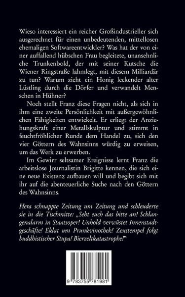 Wieso interessiert ein reicher Großindustrieller sich ausgerechnet für einen unbedeutenden, mittellosen ehemaligen Softwareentwickler? Was hat der von einer auffallend hübschen Frau begleitete, unansehnliche Trunkenbold, der mit seiner Kutsche die Wiener Ringstraße lahmlegt, mit diesem Milliardär zu tun? Warum zieht ein Honig leckender alter Lüstling durch die Dörfer und verwandelt Menschen in Hühner?Noch stellt Franz diese Fragen nicht, als sich in ihm eine zweite Persönlichkeit mit außergewöhnlichen Fähigkeiten entwickelt. Er erliegt der Anziehungskraft einer Metallskulptur und stimmt in feuchtfröhlicher Runde dem Handel zu, sich den vier Göttern des Wahnsinns würdig zu erweisen, um das Werk zu erwerben. Im Gewirr seltsamer Ereignisse lernt Franz die arbeitslose Journalistin Brigitte kennen, die sich eine neue Existenz aufbauen will und begibt sich mit ihr auf die abenteuerliche Suche nach den Göttern des Wahnsinns.