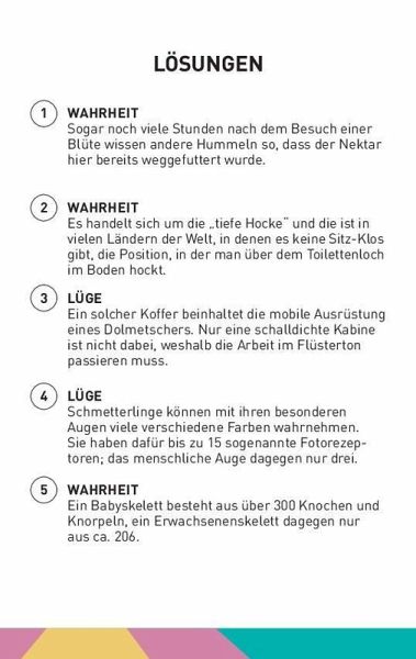 Erkennen sich Hummeln tatsächlich am Fußgeruch und ist "Nackenbeißer" ein anderes Wort für Vampir? Stelle dich der Herausforderung und finde heraus, wer in deiner Familie oder in deinem Freundeskreis der wahre Quiz-Meister ist! Egal ob du allein oder gemeinsam mit deiner Familie oder Freunden spielst: Dieser handliche Quiz-Block bietet 250 skurrile Behauptungen, die manchmal kaum zu glauben sind. Perfekt für Kinder ab 10 Jahren und Erwachsene, die Spaß am Rätseln haben. Wer entlarvt unsere Behauptungen? Und wer muss raten? Werde mit uns zum Quizchampion und lerne ganz nebenbei spannende neue Fakten dazu. Denn im übersichtlichen Lösungsteil findest du nicht nur die richtigen Antworten, sondern auch verblüffende Hintergrundinformationen, die dich erstaunen werden. Entdecke es jetzt und bringe den Spielspaß in dein Zuhause!