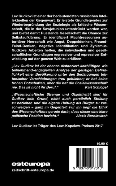 Der Band mit gesammelten Schriften des Soziologen Lev Gudkov bietet ein Modell zur Analyse der sozialen Grundlagen autoritärer Herrschaft: Angst, Freund-Feind-Denken, negative Identifikation und Zynismus. Gudkov identifiziert einen anthropologischen Typus, den durch Gewalt und staatliche Unterdrückung geschaffenen Homo Sovieticus. Die Studien ermöglichen, die individuellen und gesellschaftlichen Grundlagen regressiver und repressiver Entwicklung auf der ganzen Welt zu erklären.