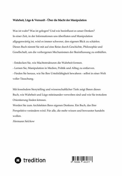 Wahrheit, Lüge & Vernunft - Über die Macht der ManipulationWir alle sind Fakten und Emotionen ausgesetzt und nicht immer sind die Grenze zwischen Wahrheit und Täuschung klartrennbar. Dieses Buch kann Ihr Schlüssel zu Klarheit und kritischem Denken sein. "Wahrheit, Lüge & Vernunft - Über die Macht der Manipulation" verbindet packendes Storytelling mit tiefgründigen wissenschaftlichen und philosophischen Erkenntnissen.Erfahren Sie, wie Manipulation seit Jahrtausenden unsere Geschichte prägt - von der Antike bis zur digitalen Gegenwart. Entdecken Sie die Mechanismen, die hinter politischer Propaganda, medialer Verzerrung und gesellschaftlicher Meinungsbildung stecken. Dieses Buch eröffnet Ihnen eine neue Perspektive auf die Welt um Sie herum und gibt Ihnen die Werkzeuge an die Hand, Manipulation zu erkennen und sich ihr bewusst zu entziehen.Warum Sie dieses Buch lesen sollten:- Faszinierende Geschichten: Lebendige Beispiele machen komplexe Themen greifbar und inspirieren zum Nachdenken.- Relevantes Wissen: Lernen Sie, wie Sie in einer Zeit von Fake News, Algorithmen und Informationsflut den Überblick behalten.- Praktische Erkenntnisse: Entwickeln Sie die Fähigkeit, Manipulation zu erkennen und Ihre eigene Urteilsfähigkeit zu stärken.- Zeitlose Philosophie: Lassen Sie sich von den Ideen großer Denker leiten, die unsere Sicht auf Wahrheit und Vernunft geprägt haben.Dieses Buch ist eine Einladung, Ihre Wahrnehmung zu schärfen und die Macht des kritischen Denkens zu nutzen. Es richtet sich an alle, die die Welt nicht nur verstehen, sondern aktiv mitgestalten wollen.Werden Sie ein Teil der Bewegung - für Wahrheit, Vernunft und ein unabhängiges Denken.Begeben Sie sich mit mir in die Tiefen der Manipulation und Täuschung!Hermann Selchow