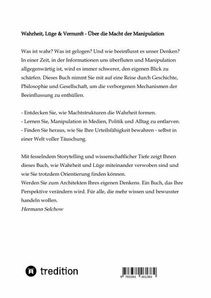 Wahrheit, Lüge & Vernunft - Über die Macht der ManipulationWir alle sind Fakten und Emotionen ausgesetzt und nicht immer sind die Grenze zwischen Wahrheit und Täuschung klartrennbar. Dieses Buch kann Ihr Schlüssel zu Klarheit und kritischem Denken sein. "Wahrheit, Lüge & Vernunft - Über die Macht der Manipulation" verbindet packendes Storytelling mit tiefgründigen wissenschaftlichen und philosophischen Erkenntnissen.Erfahren Sie, wie Manipulation seit Jahrtausenden unsere Geschichte prägt - von der Antike bis zur digitalen Gegenwart. Entdecken Sie die Mechanismen, die hinter politischer Propaganda, medialer Verzerrung und gesellschaftlicher Meinungsbildung stecken. Dieses Buch eröffnet Ihnen eine neue Perspektive auf die Welt um Sie herum und gibt Ihnen die Werkzeuge an die Hand, Manipulation zu erkennen und sich ihr bewusst zu entziehen.Warum Sie dieses Buch lesen sollten:- Faszinierende Geschichten: Lebendige Beispiele machen komplexe Themen greifbar und inspirieren zum Nachdenken.- Relevantes Wissen: Lernen Sie, wie Sie in einer Zeit von Fake News, Algorithmen und Informationsflut den Überblick behalten.- Praktische Erkenntnisse: Entwickeln Sie die Fähigkeit, Manipulation zu erkennen und Ihre eigene Urteilsfähigkeit zu stärken.- Zeitlose Philosophie: Lassen Sie sich von den Ideen großer Denker leiten, die unsere Sicht auf Wahrheit und Vernunft geprägt haben.Dieses Buch ist eine Einladung, Ihre Wahrnehmung zu schärfen und die Macht des kritischen Denkens zu nutzen. Es richtet sich an alle, die die Welt nicht nur verstehen, sondern aktiv mitgestalten wollen.Werden Sie ein Teil der Bewegung - für Wahrheit, Vernunft und ein unabhängiges Denken.Begeben Sie sich mit mir in die Tiefen der Manipulation und Täuschung!Hermann Selchow