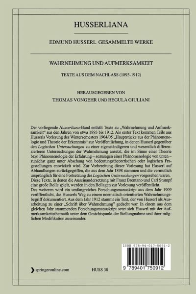 Der vorliegende Husserliana-Band enthält Texte zu "Wahrnehmung und Aufmerksamkeit" aus den Jahren von etwa 1893 bis 1912. Als erster Text kommen Teile aus Husserls Vorlesung des Wintersemesters 1904/05 "Hauptstücke aus der Phänomenologie und Theorie der Erkenntnis" zur Veröffentlichung, in denen Husserl gegenüber den Logischen Untersuchungen zu einer eigenständigeren und wesentlich differenzierteren Untersuchung der Wahrnehmung ansetzt, die im Sinne einer Theorie bzw. Phänomenologie der Erfahrung - sozusagen einer Phänomenologie von unten - zunächst ganz unter Absehung von bedeutungstheoretischen oder logischen Fragestellungen entwickelt wird. Zur Vorbereitung dieser Vorlesung hat Husserl auf Abhandlungen zurückgegriffen, die aus dem Jahr 1898 stammen und die vermutlich ursprünglich für eine Fortsetzung der Logischen Untersuchungen vorgesehen waren. Diese Texte, in denen die Auseinandersetzung mit Franz Brentano und Carl Stumpf eine große Rolle spielt, werden in den Beilagen zur Vorlesung veröffentlicht. Des weiteren wird ein umfangreiches Forschungsmanuskript aus dem Jahr 1909 veröffentlicht, das Husserls Weg zu einem noematisch orientierten Wahrnehmungsbegriff dokumentiert. Aus dem Jahr 1912 stammt ein Text, der von Husserl als Ausarbeitung zu einer "Schrift über Wahrnehmung" gedacht war. In einem aus dem gleichen Jahr stammenden Forschungsmanuskript setzt sich Husserl mit der Aufmerksamkeitsthematik unter dem Gesichtspunkt der Stellungnahme und ihrer möglichen Modifikation auseinander.