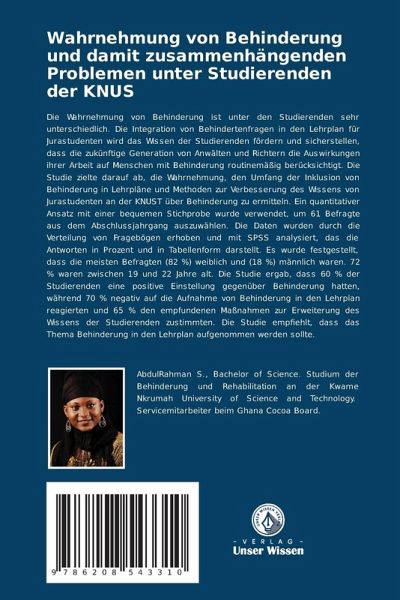 Die Wahrnehmung von Behinderung ist unter den Studierenden sehr unterschiedlich. Die Integration von Behindertenfragen in den Lehrplan für Jurastudenten wird das Wissen der Studierenden fördern und sicherstellen, dass die zukünftige Generation von Anwälten und Richtern die Auswirkungen ihrer Arbeit auf Menschen mit Behinderung routinemäßig berücksichtigt. Die Studie zielte darauf ab, die Wahrnehmung, den Umfang der Inklusion von Behinderung in Lehrpläne und Methoden zur Verbesserung des Wissens von Jurastudenten an der KNUST über Behinderung zu ermitteln. Ein quantitativer Ansatz mit einer bequemen Stichprobe wurde verwendet, um 61 Befragte aus dem Abschlussjahrgang auszuwählen. Die Daten wurden durch die Verteilung von Fragebögen erhoben und mit SPSS analysiert, das die Antworten in Prozent und in Tabellenform darstellt. Es wurde festgestellt, dass die meisten Befragten (82 %) weiblich und (18 %) männlich waren. 72 % waren zwischen 19 und 22 Jahre alt. Die Studie ergab, dass 60 % der Studierenden eine positive Einstellung gegenüber Behinderung hatten, während 70 % negativ auf die Aufnahme von Behinderung in den Lehrplan reagierten und 65 % den empfundenen Maßnahmen zur Erweiterung des Wissens der Studierenden zustimmten. Die Studie empfiehlt, dass das Thema Behinderung in den Lehrplan aufgenommen werden sollte.